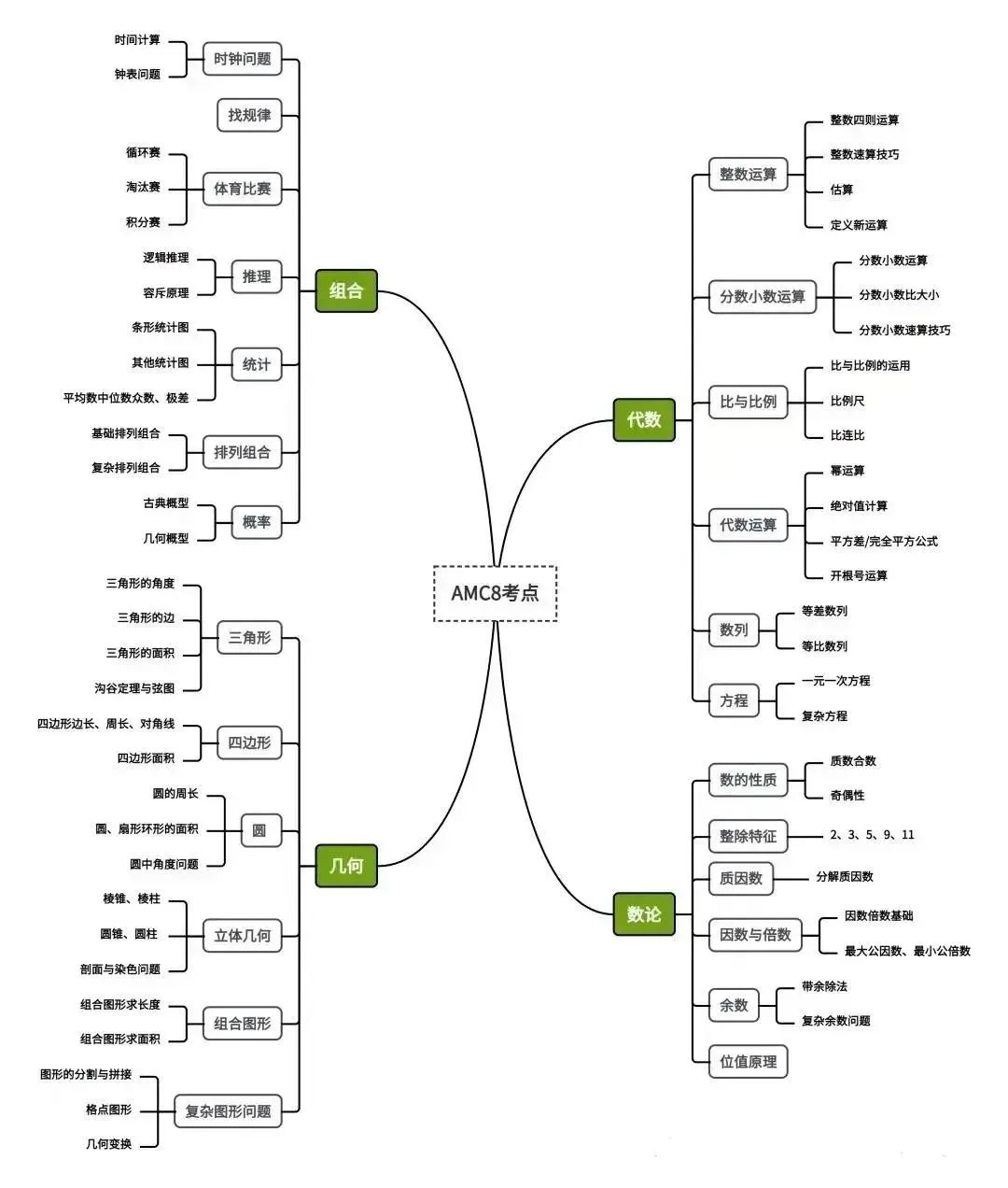 AMC8(美国数学竞赛 8 年级组)面向 8 年级及以下学生,考点聚焦初中及小学阶段核心数学知识,侧重基础概念的灵活应用与逻辑思维,无超纲内容,具体可分为四大模块: