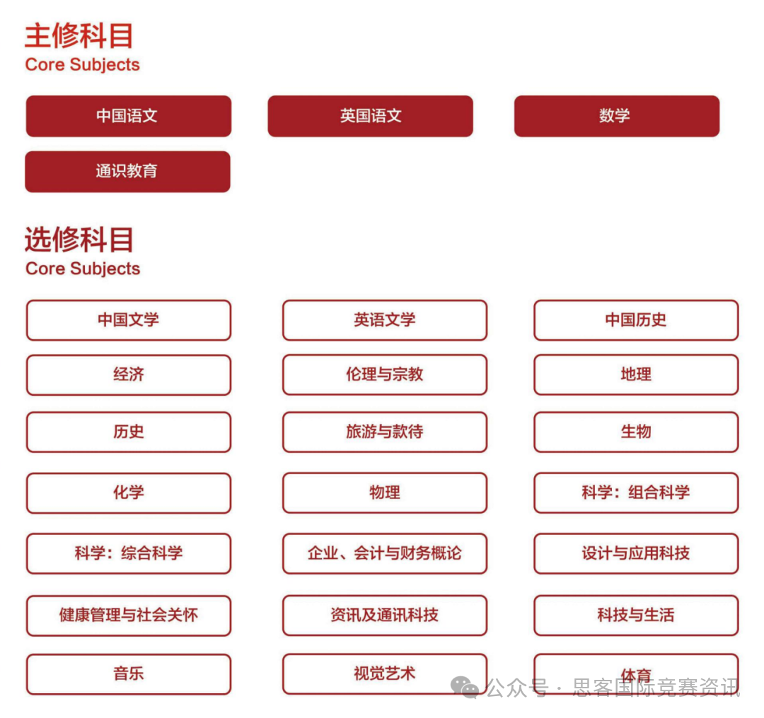 【核心科目】必修中文、英文、数学、通识教育4门。