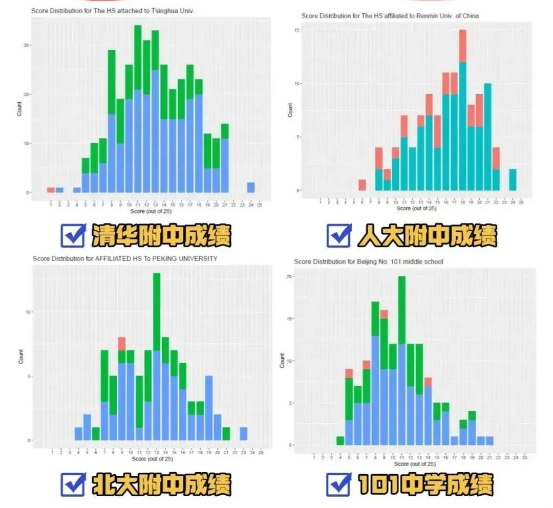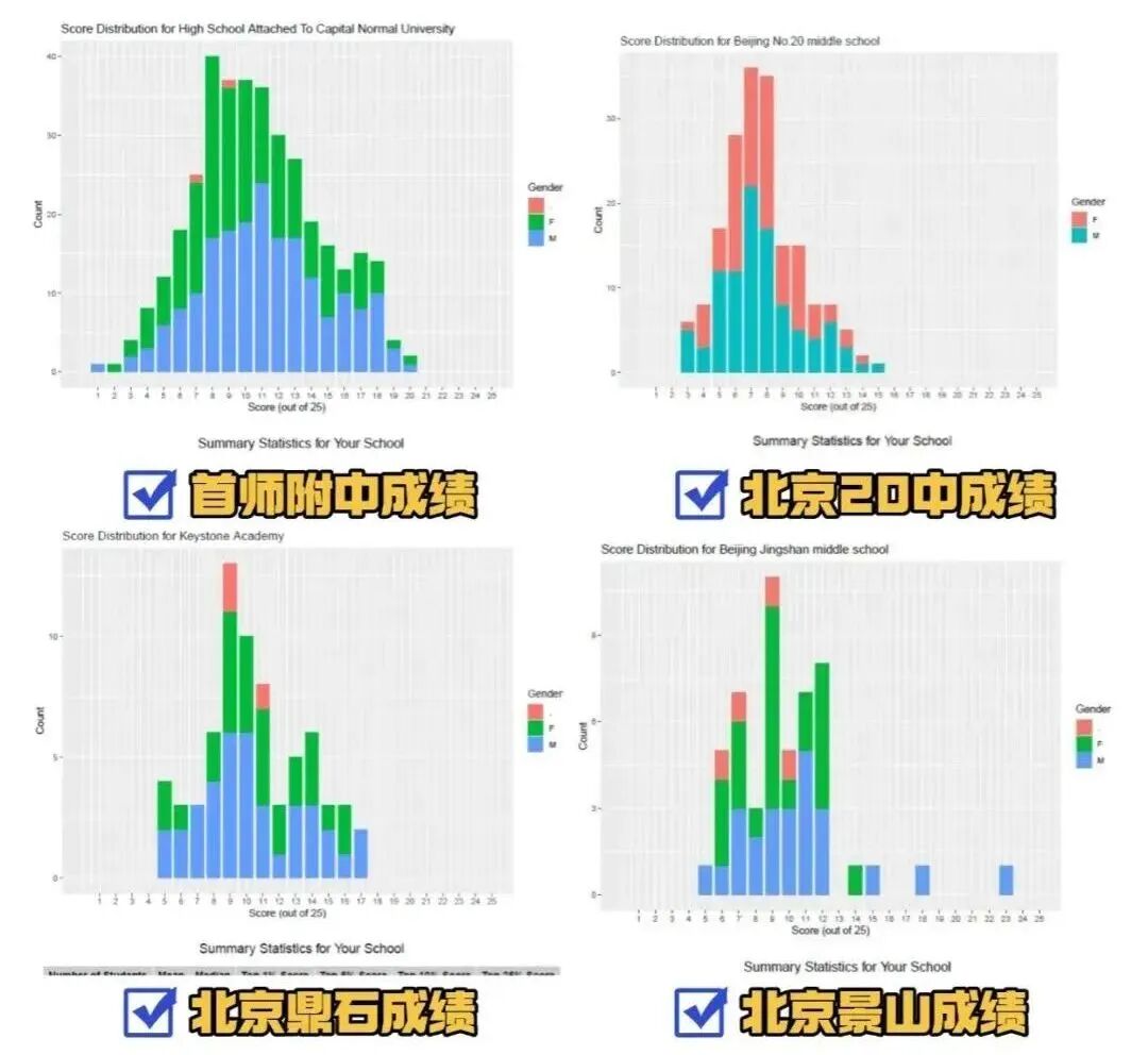 更值得关注的是,公开的成绩分布图表中,还专门呈现了清华附中、人大附中、北大附中等北京顶尖名校的学生成绩情况——能清晰看到不同名校学生在AMC8中的表现差异,这一细节本身就说明,这些重点学校对AMC8成绩的关注度极高,甚至将其视为衡量学生数学能力的重要参考。