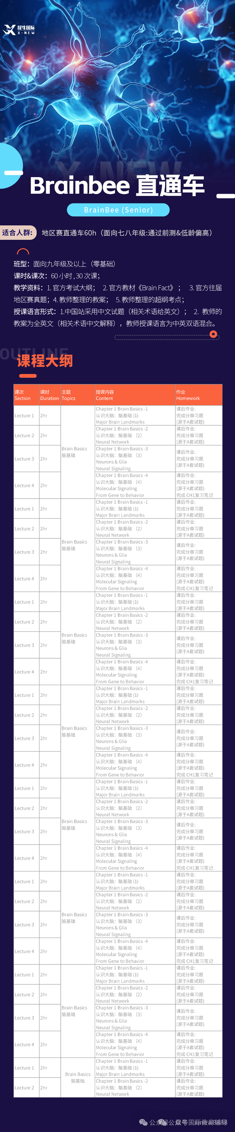 针对不同阶段备考BrainBee竞赛的同学,咱们犀牛开始有专门的BrainBee竞赛培训课程,包含BrainBee竞赛junior组和senior组都有对应的课程可以选择。