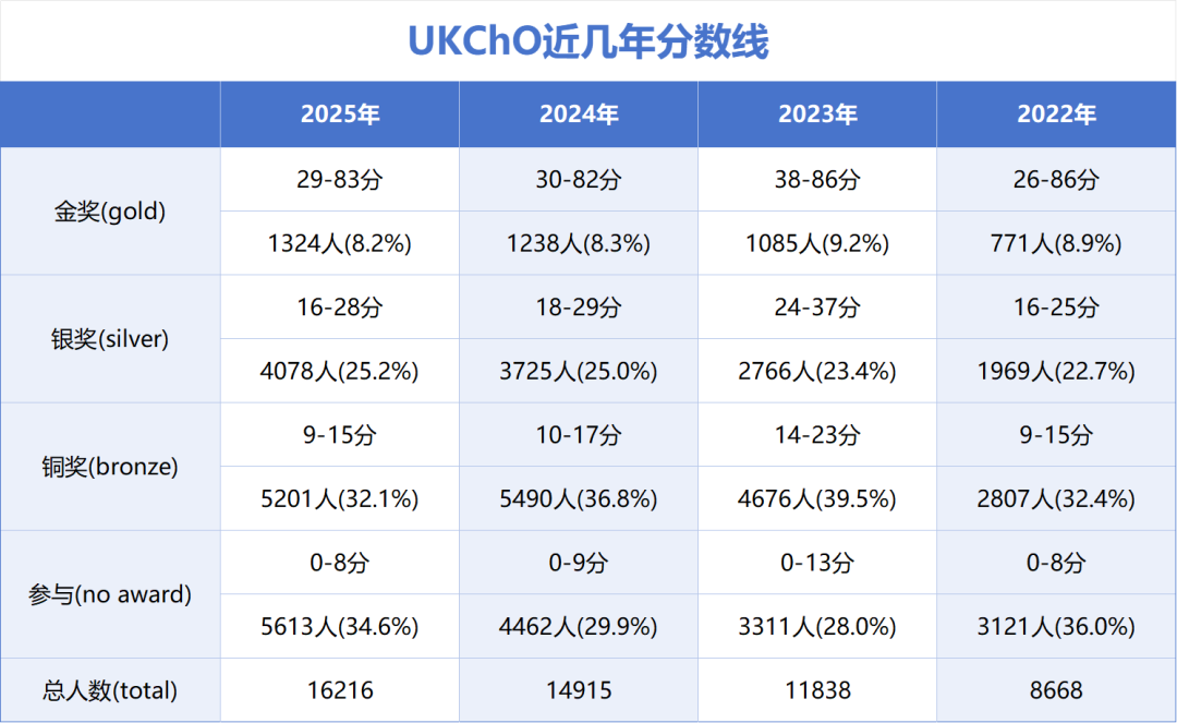 具体的分数线会根据考试的难易程度和参赛学生的表现而有所变化。同时,所有试卷都会寄回英国由指定考官进行评判。如果整体成绩出色,获奖比例可能会增加。