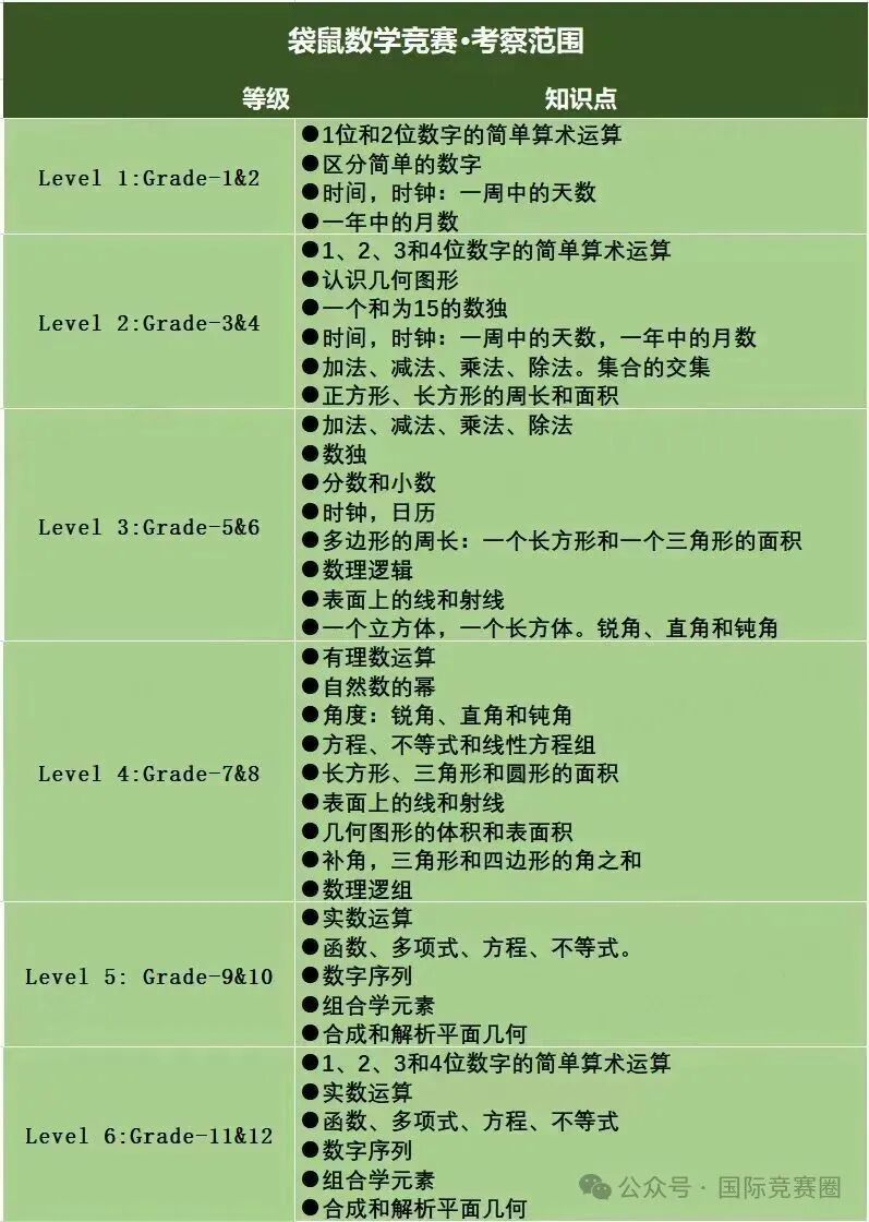 袋鼠数学竞赛针对不同年级的学生都设计了针对性的考题,每个等级考试内容都不同,详情如下: