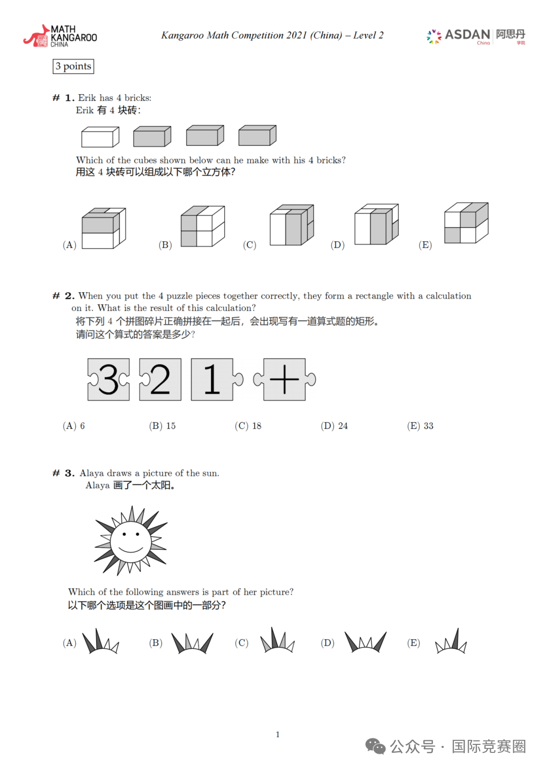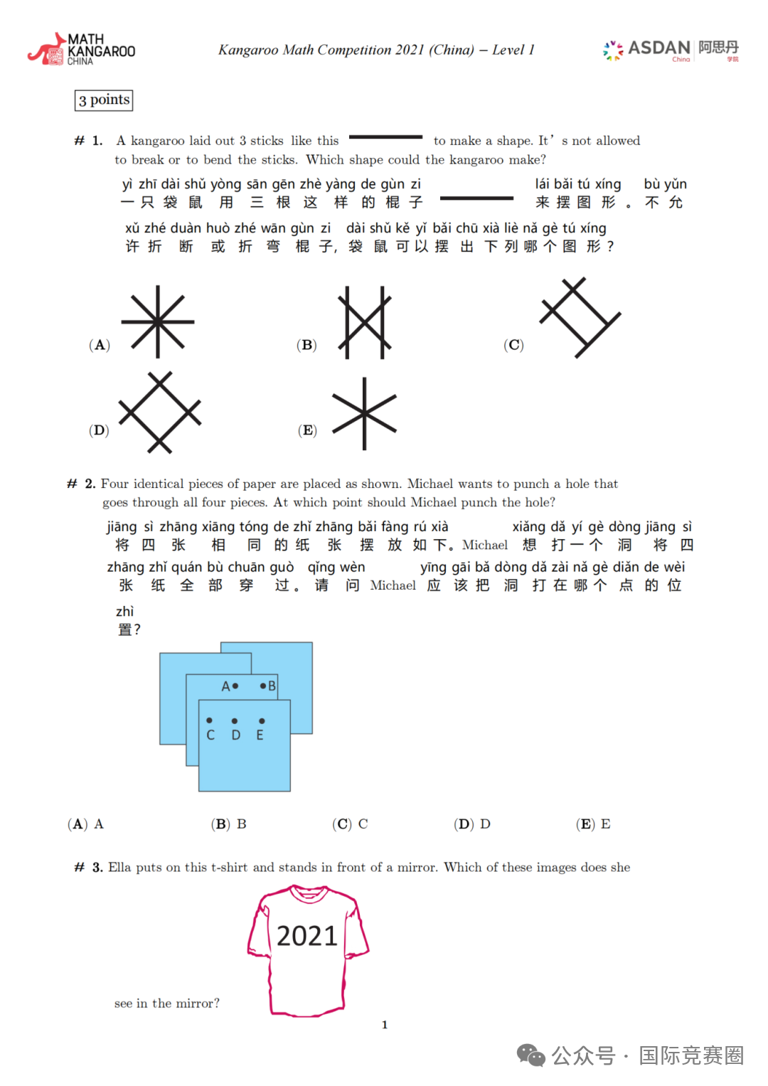 袋鼠数学竞赛真题等级A-Level 1:小学,Grade1-2