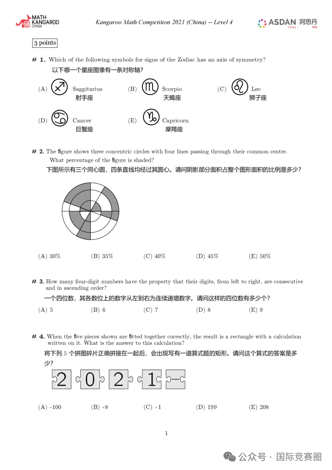 袋鼠数学竞赛真题等级D-Level 4:中学,Grade7-8