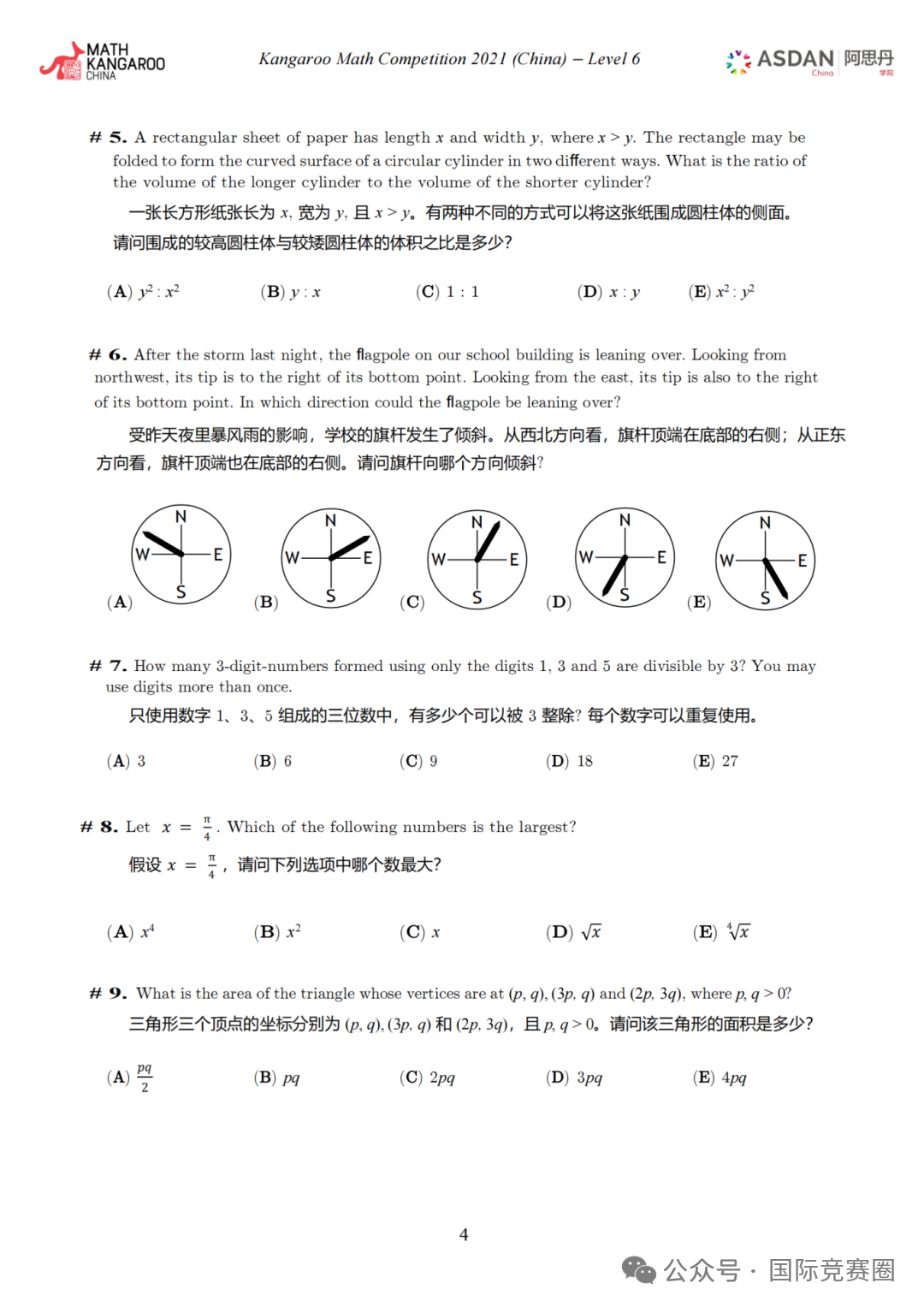 袋鼠数学竞赛真题等级E-Level 5:中学,Grade9-10