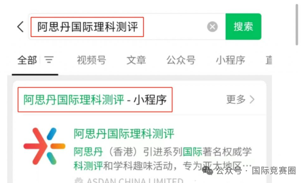 步骤1:微信搜索“阿思丹国际理科测评”小程序,点击进入。