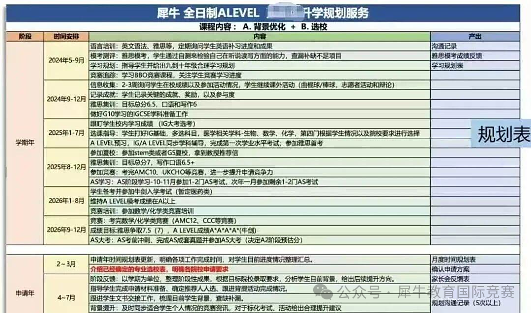 犀牛教育ALEVEL脱产课程服务完善,不仅涵盖课程教学还有专门的升学老师对学生进行留学申请规划和指导服务,给学生匹配相应的背景提升服务