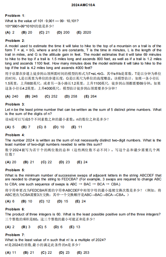 AMC10的考试知识点涵盖9-10年级的数学内容,包括初等代数、基础几何学(勾股定理、面积体积公式等)、初等数论和组合问题,不包含三角函数、进阶数学和高等几何学的内容。