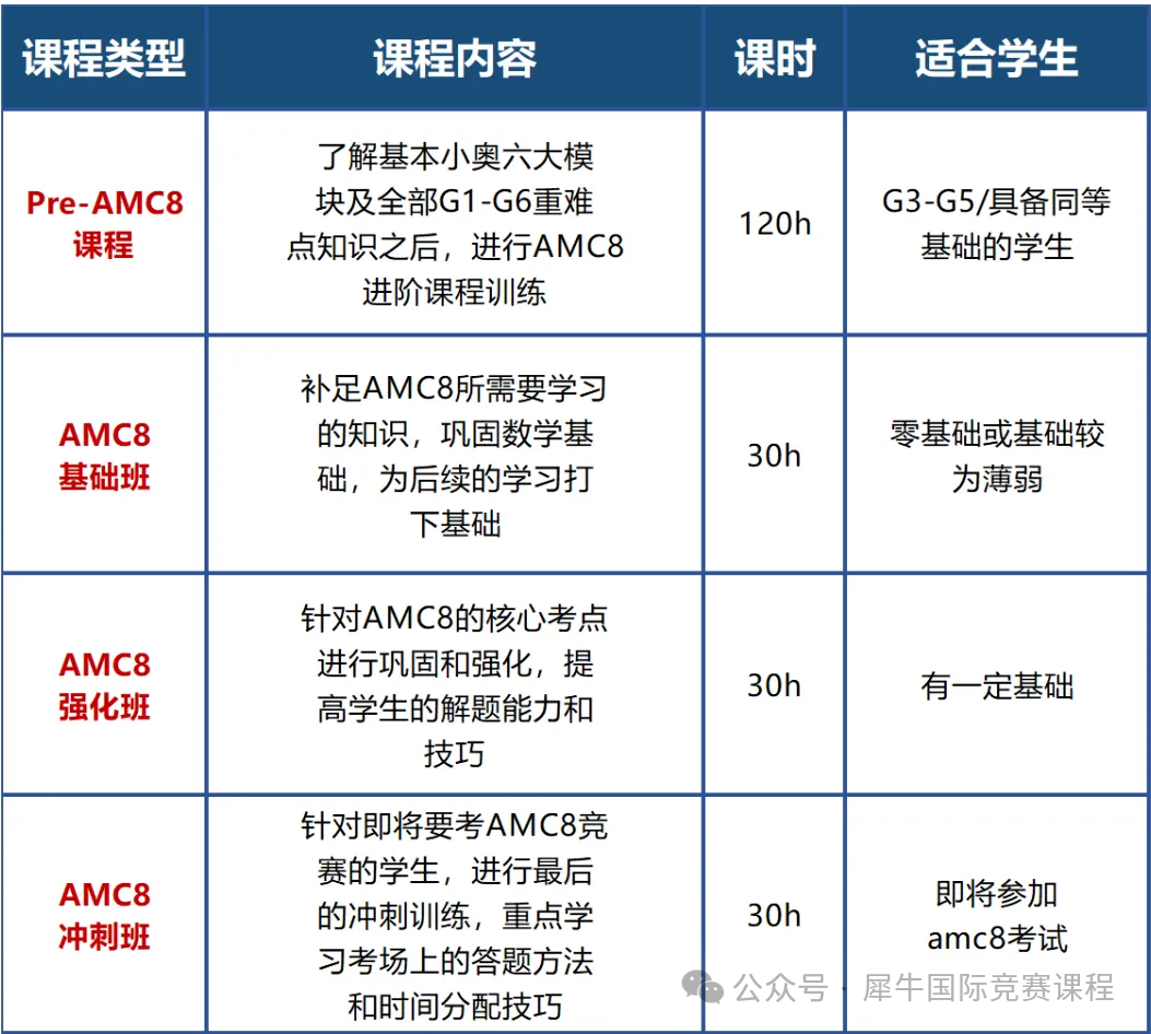 2026年AMC8竞赛考试时间已经公布,同学们抓住黄金备考期,AMC8培训机构哪家好?AMC8培训班首选犀牛,犀牛今年AMC8满分奖就有26个,犀牛AMC8数学竞赛培训课程精心设计了衔接入门、基础强化、冲刺拔高多个阶段,不同基础的孩子都可以匹配,犀牛AMC8秋季班都已上线