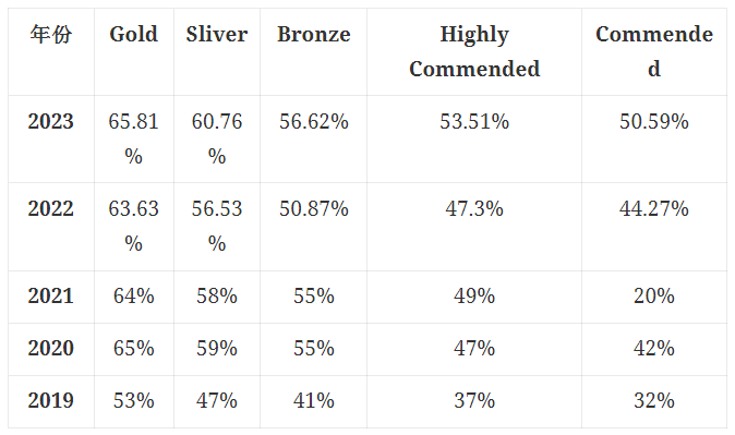 以上是近5年的BBO金银铜奖获奖比例,我们能够清晰看到,BBO过去五年获奖比例整体有一定上升趋势