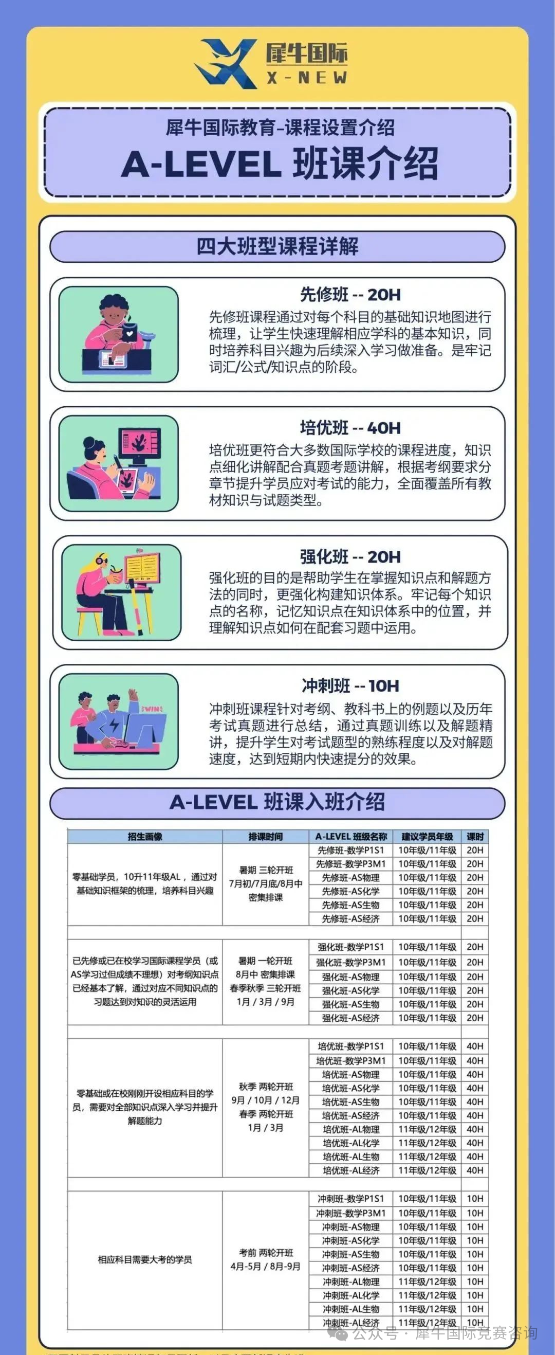 想补Alevel却愁没适配课程?犀牛Alevel课程覆盖多班型、全科目,不同基础学生都能找到方向: