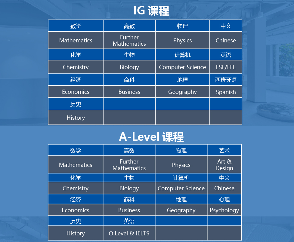 除此之外,学生需依据自身情况在以下12门科目中自选4门选修科目作为主课,为将来A-Level课程学习打好基础: