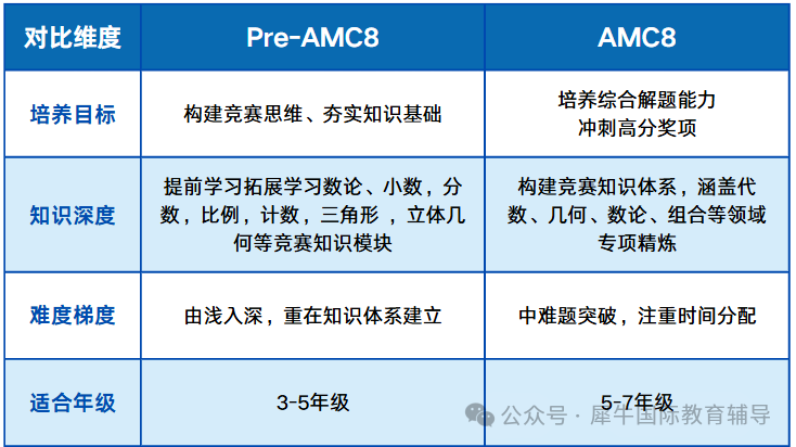Pre-AMC8 堪称“以赛促学”理念的启蒙前置课,AMC8 则是“以学促赛”模式的实战竞技场。前者着重于方法探寻与思维拓展,后者聚焦于速度与准确度的双重考验。