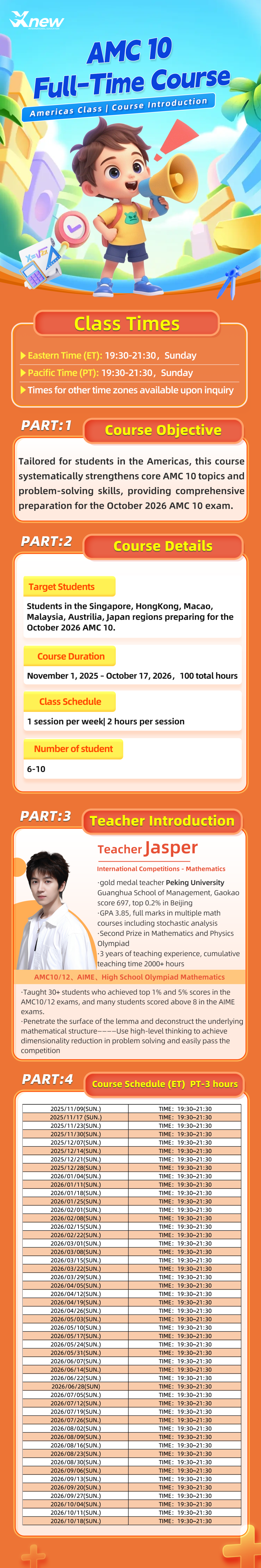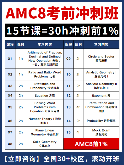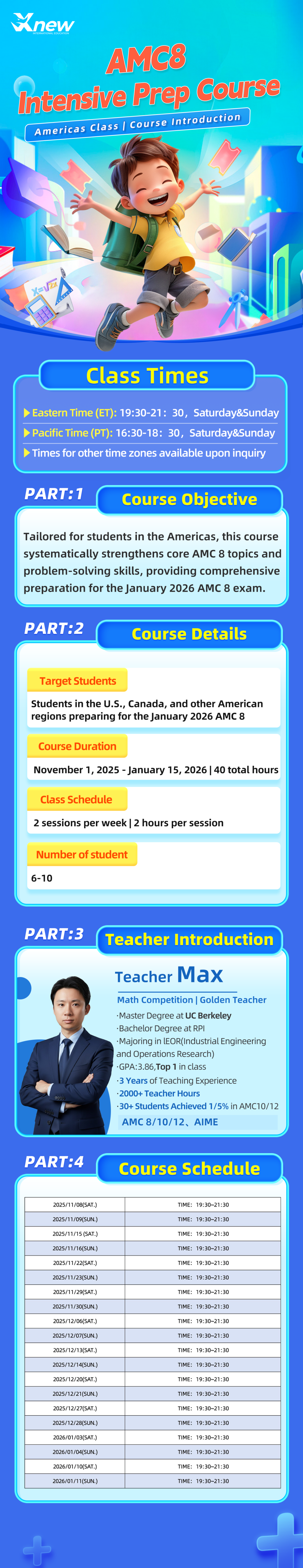 课程目标:专为亚洲地区的学生设计的课程。系统性的学习AMC8知识点,解题技巧,准备2026年1月的AMC8考试。