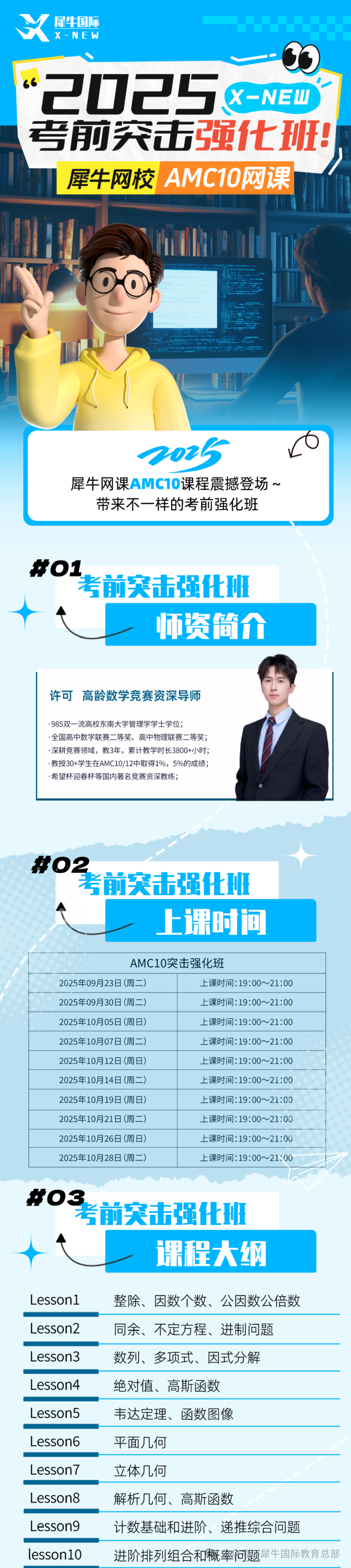 课程特色:犀牛AMC10网课采用3-8人小班授课模式,确保每个学生都能获得充分关注,课程内容紧扣AMC10考试的核心考点和命题趋势,帮助学生精准把握重点难点。