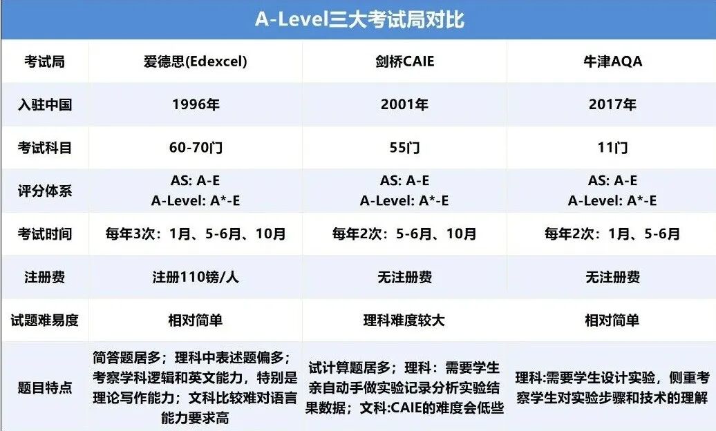 A-Level课程还有一个最大的特别之处,就是它是分不同考试局的。常见的考试局有CAIE剑桥国际考试局、AQA考试局和爱德思考试局。