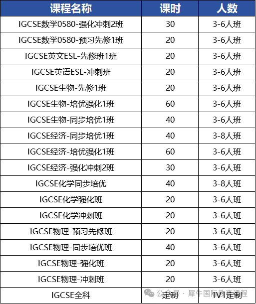 开设有IGCSE先修班、IGCSE强化班、IGCSE冲刺班、IGCSE全程班,学生可根据自己基础选择合适的班型。