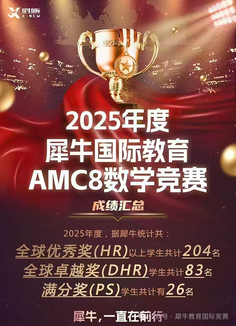 2025年犀牛有26名学员获得AMC8满分,近300名学员获得AMC8竞赛前1%/前5%高含金量奖项,获奖率超85%,AMC8竞赛交给犀牛,出分稳定,学生开心,家长放心!