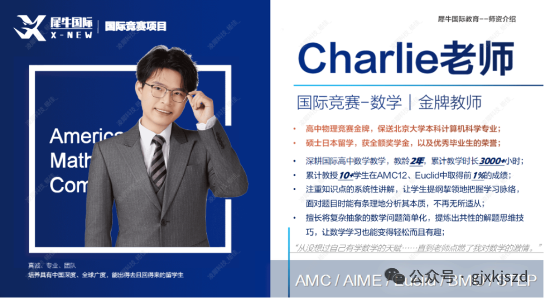 犀牛的老师均来自海内外名校毕业的高材生,深谙青少年数学提分方法,教学人经验丰富,带着学生梳理AMC/1012考点,补充基本知识,完善知识框架。传授解题技巧和思路,帮助学生拿奖。