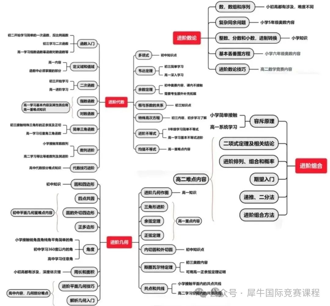 AMC10数学竞赛的考察内容相较于AMC8竞赛,难度更深,以进阶代数,进阶几何,进阶数论和进阶组合这三个方向为主要考察模块。