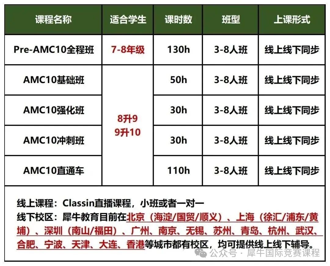 犀牛国际专注AMC竞赛培训多年,适用于不同基础的学生,为了助力考生们备考AMC10数学竞赛,犀牛专业辅导老师帮助梳理难点,强化提升,更好冲奖!
