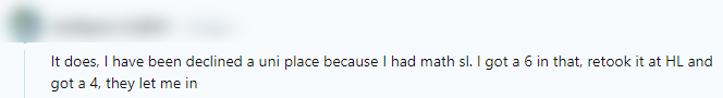 “数学SL成绩6被拒绝的专业,重考数学HL,成绩为4却能够被该大学的同一个专业录取。”