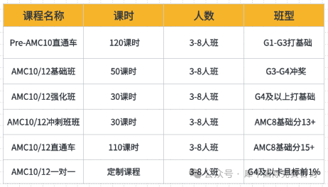 聚焦 AMC10数学竞赛备考群体,设置丰富培训课程,包含基础班、强化班、冲刺班等阶段性班型,以及全程班、优享班等特色班型,满足不同水平学生的学习需求。