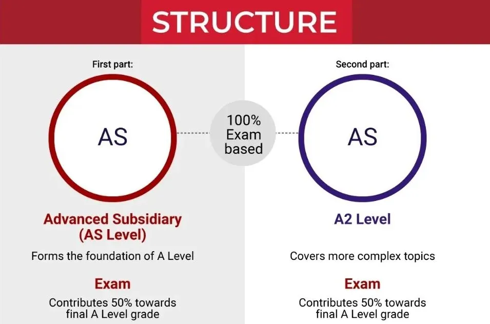 A-level课程的学制为两年。第一年称为AS水准,学生通常选择自己擅长且有兴趣的4-5门课;第二年称为A2水准,学生可以选择AS水准中较为优秀的3-4门课继续学习。