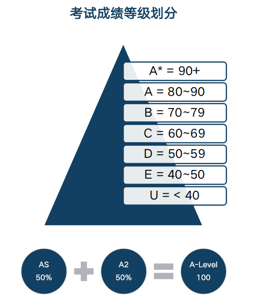 A-Level的成绩是等级制的,就是没有具体的分数,只靠等级划分,从高到低分为A*、A、B、C、D、E、U这几个等级,U以上是及格。一般来说,A*代表90%的分数,A代表80%的分数,B代表70%的分数,以此类推。