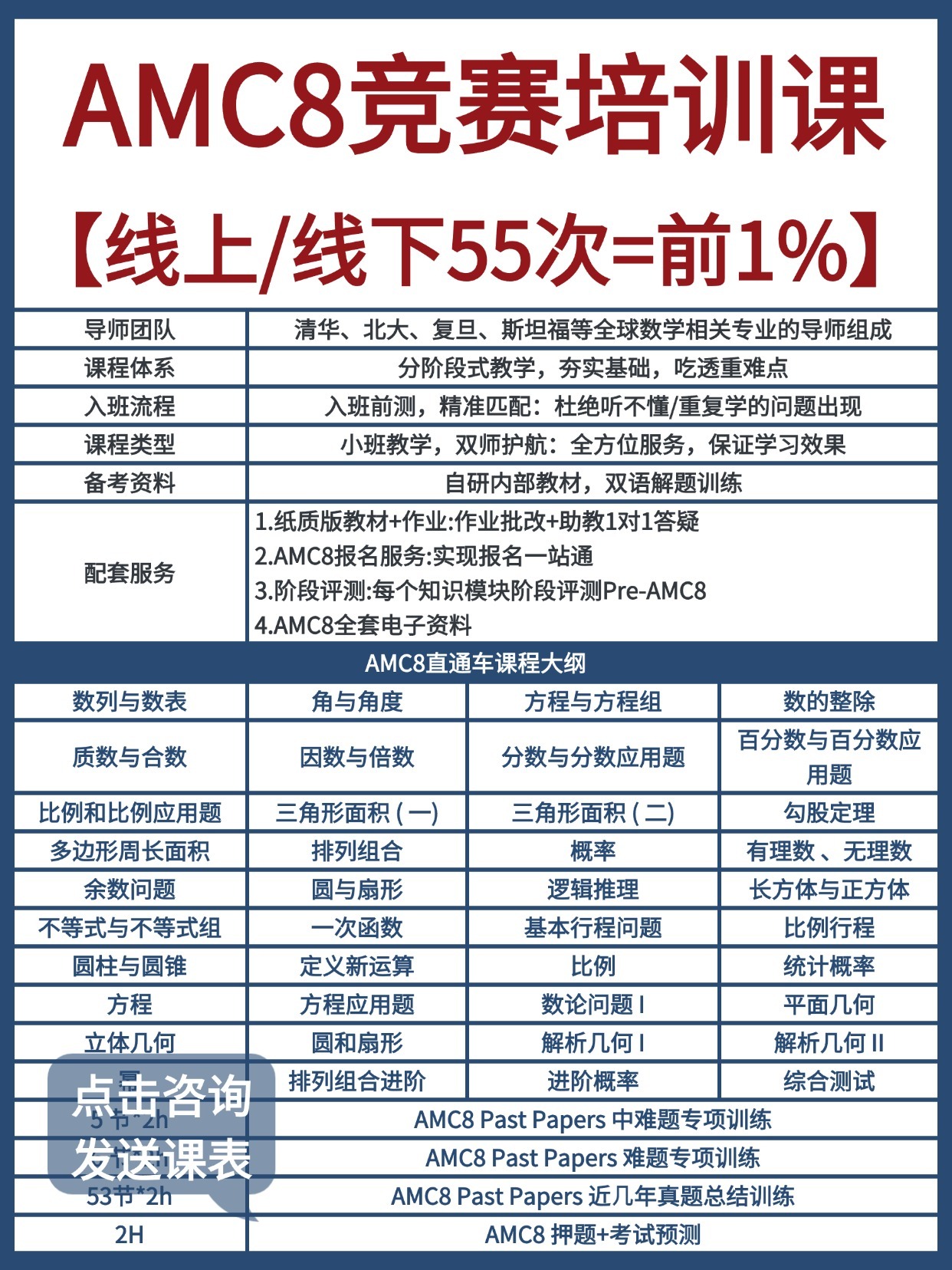 如果孩子的基础好,想要冲刺2026年1月的AMC8竞赛,适合AMC8强化模考班或者AMC8冲刺班。