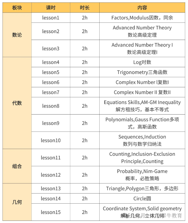 课程内容:帮助考生补充至AMC12水平(三角函数、复数、向量),再培养学生的解题能力和创新思维。熟悉了解其命题风格,再进行针对性的查缺补漏和提高
