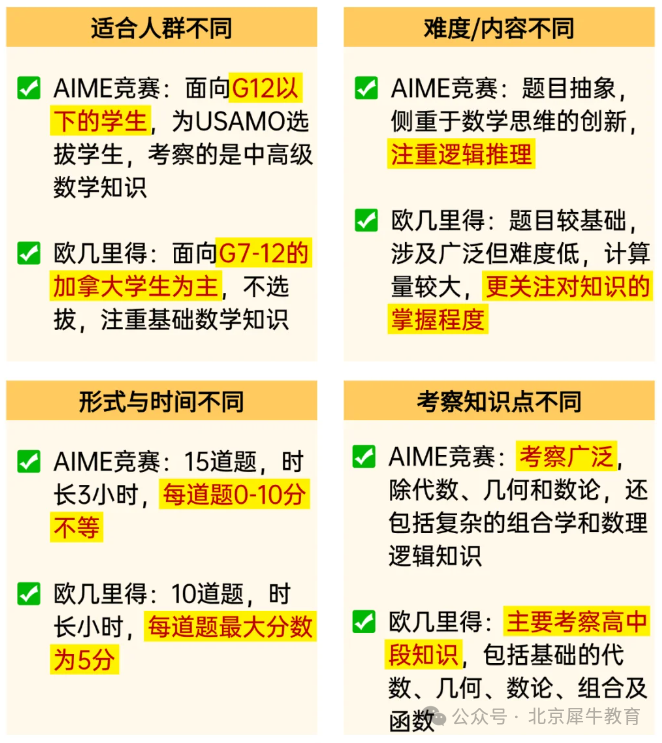 虽然欧几里得被称为AIME的平替版,但是AIME和欧几里得竞赛在竞赛内容、难度、考试形式、考察知识点等方面有一定的差异,详细见下图:
