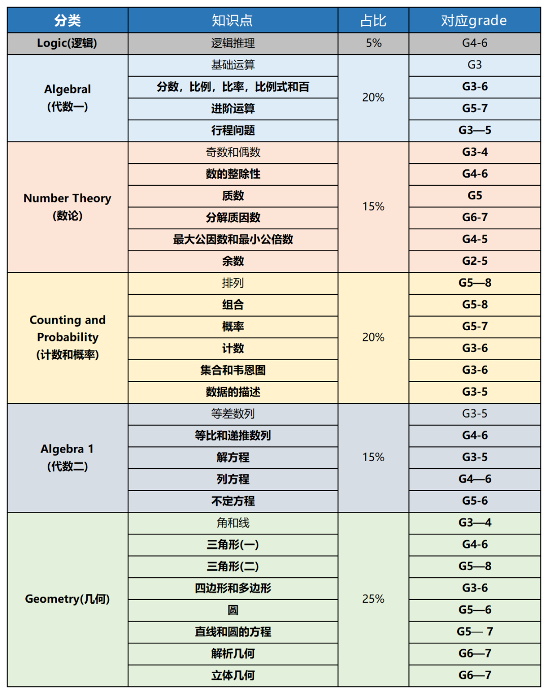 AMC8主要考察小学和初中的知识,占比约为6:4,知识点多为代数,数论,计数和组合。