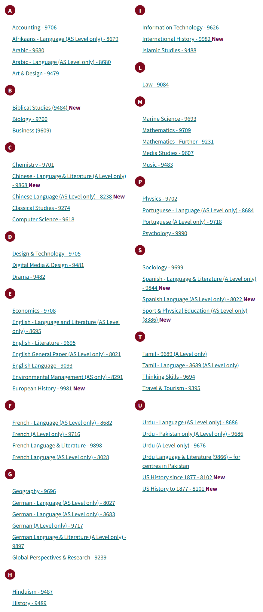 CIE考试局AS&A-Level开设课程:(上下滑动可查看完整内容)