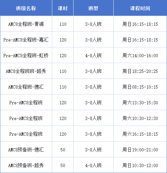 犀牛AMC8培训课程,开设班型包括:AMC8预备班、Pre-amc8全程班、AMC8全程班、AMC8优享班等多种班型,适合8年级以下的学生学习。
