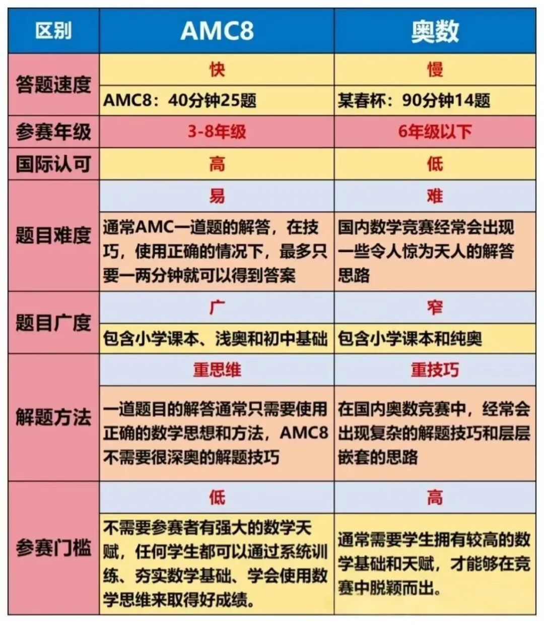 AMC8和奥数的区别体现在,AMC8更加注重对学生逻辑思维能力与实际问题解决能力的考查。是一个基于基本数学定理的思维训练,强调对数学思维知识的本质理解与应用。