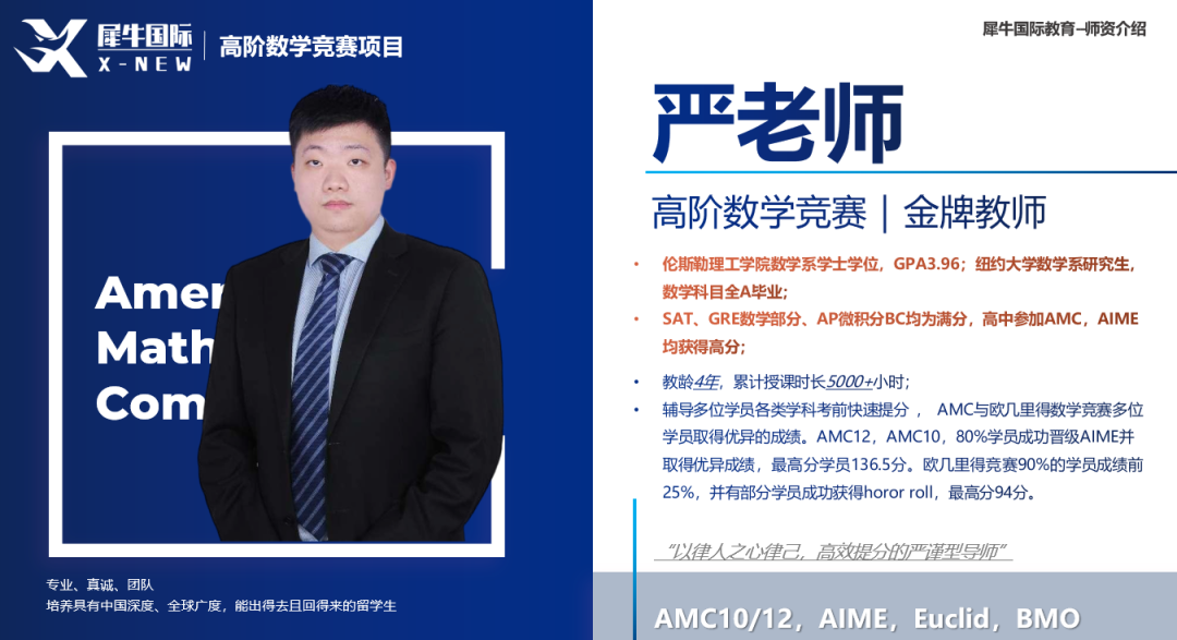 犀牛针对AMC10/12竞赛晋级AIME的学生,分别开设了不同班型,AIME培训课程师资都是来自国内外名校的牛师,培训经验极其丰富,帮助过众多同学们在AIME的考试中取得过高分成绩。