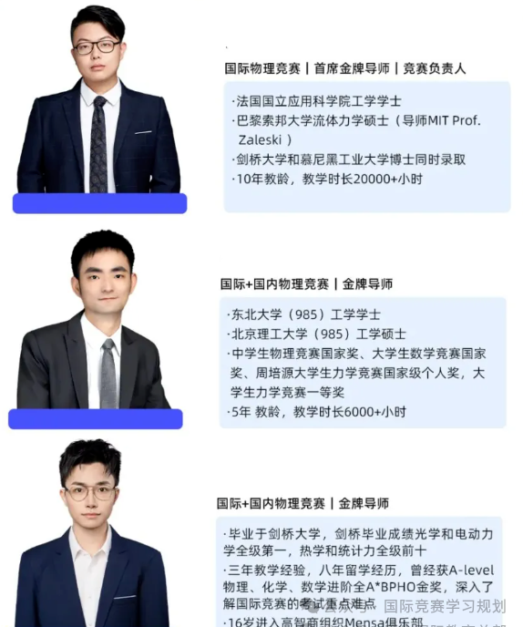 师资团队: 我们的导师均拥有多年的物理竞赛辅导经验,培养出众多在BPhO、IPC/SPC等赛事中斩获金奖、超级金奖的学员。不仅精通知识,更精通竞赛的考点规律、出题风格和评分标准,可以帮助学生冲刺金奖。