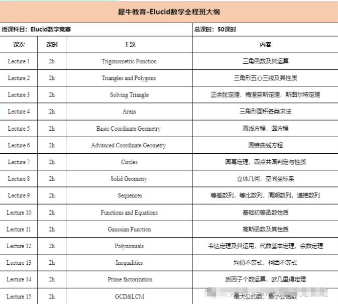 上海欧几里得数学竞赛培训课程安排: