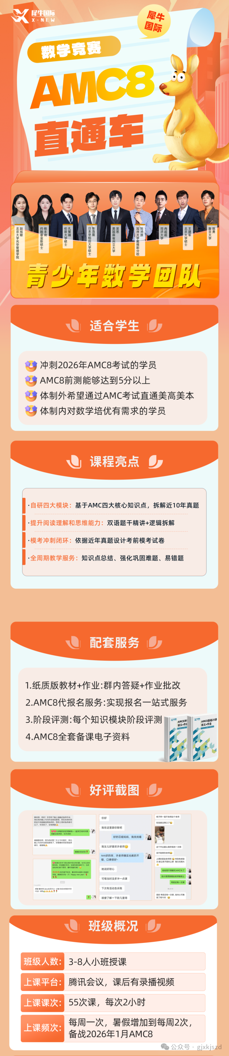 AMC8是由美国数学协会(MAA)主办的一项面向八年级及以下学生的国际数学竞赛。主要面向8年级(初二)及以下的初中和小学高年级学生。不仅考察学生的数学知识,还注重培养学生的逻辑思维和问题解决能力,全球认可度高,每年吸引30万学生参与,备受各国际学校和重点中学学生关注,是一项极具挑战性的数学竞赛。