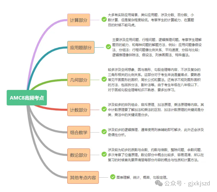 AMC8考试的内容会涉及到各个年级的数学知识,包括计算、应用题、几何、计数、组合数学、数论、其他等,以下是一些近几年AMC8考试中经常出现的考点: