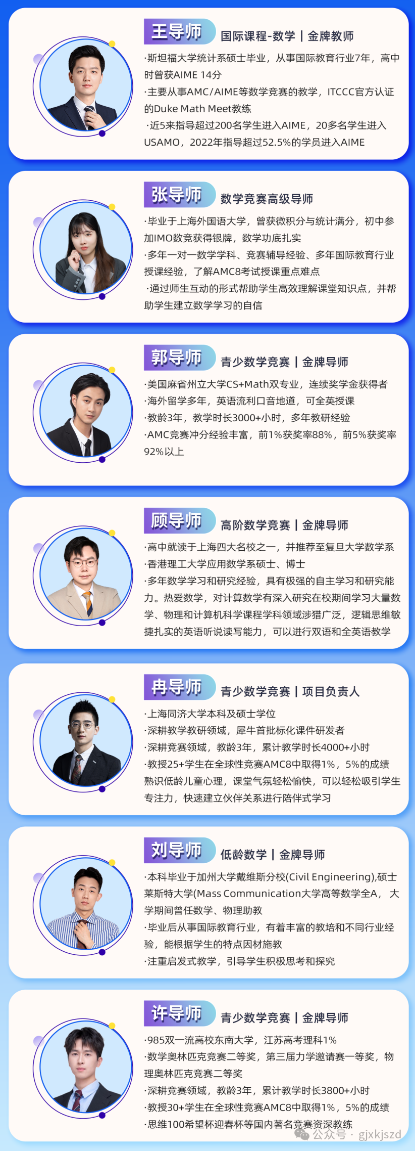 适合学生:针对参加过AMC8数学竞赛但成绩不太理想,或对AMC8数学竞赛重难点掌握不到位的学生,课程需30小时,针对AMC8考试重难点题型和知识点进行强化提升,提高学生解题能力。
