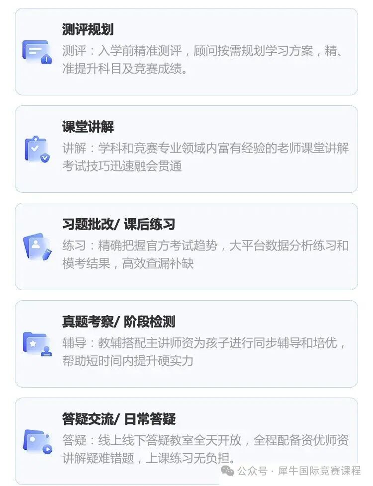 犀牛IGCSE培训课程有IGCSE先修班,IGCSE培优班,IGCSE强化班,IGCSE冲刺班,IGCSE脱产课程,包含科目有数学、物理、化学、生物、计算机和经济等热门科目,可提供线下面授和线上学习。