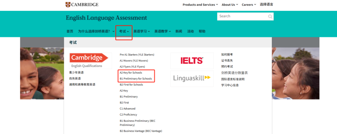 步骤2:点击“考试”选择“青少年英语”→“A2 Key for Schools(KET)”或者“B1 Preliminary for Schools(PET)”