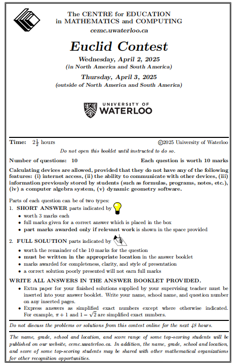 2025年欧几里得数学竞赛真题共10道题,150分钟,总分100分。分为简答题和全解题两种题型。