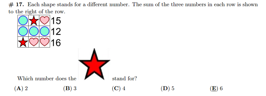 这道题是典型的袋鼠数学基础运算题,但不是纯粹的加、减、乘、除运算,而是需要通过分析才能运算。这题的突破点在第二行3个圆等于12 ,即可通过代入的方式算出红星代表的数字。