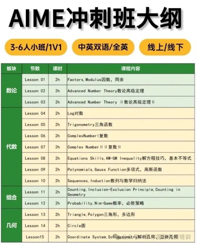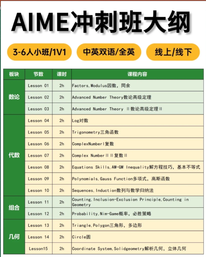 班型可选 3-8 人小班(互动性强)或 1 对 1(针对偏科学生),中英双语授课,提前适应 AIME 英文题干环境。
