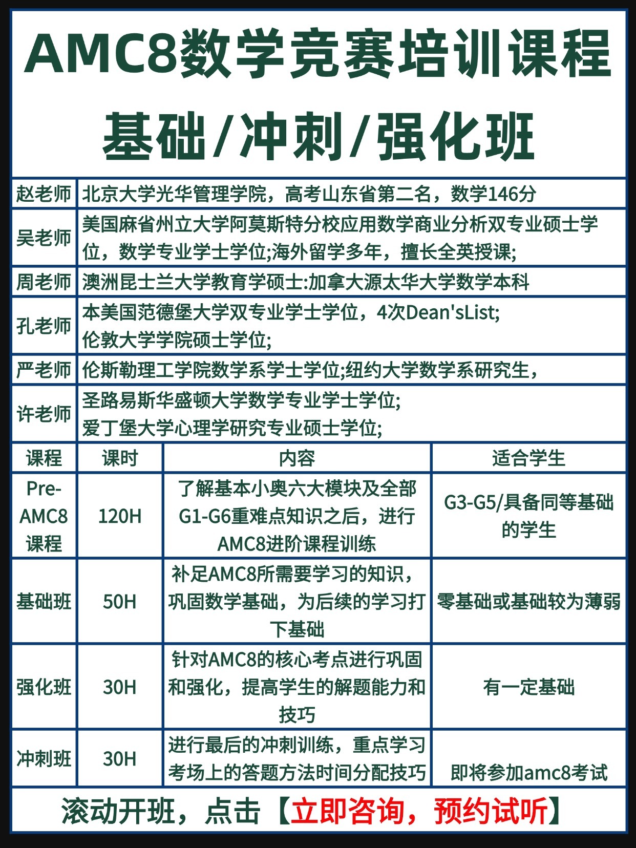 犀牛教育也提供AMC8基础/冲刺/强化多种班型,了解AMC8课程可以直接私信客服