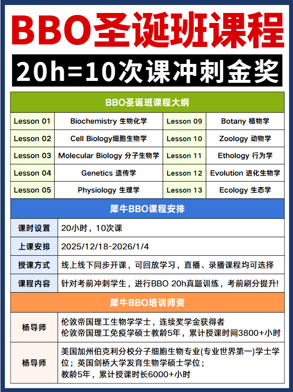 BBO生物竞赛考试时间突然提前,同学们都不知所措,再加上考试时间与很多学校的期末考试时间重叠,使得备考变得尤为困难。还没备考好的同学也不要慌了神,给大家整理了考前30天备考规划,犀牛BBO圣诞班招生中,20h10次课带你补齐短板,强化冲刺!