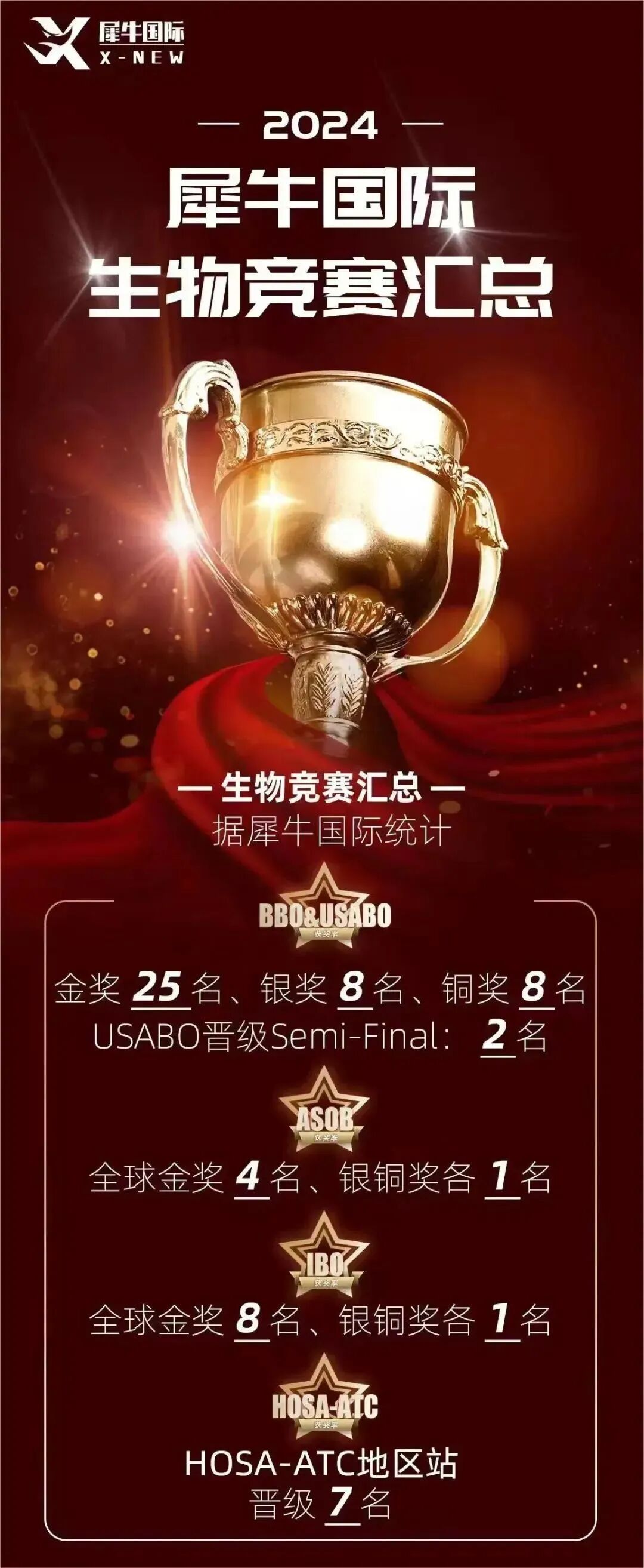 据犀牛国际统计USABO/BBO金奖 25 名、银奖 8名、铜奖8名,USABO晋级Semi-Final:2名